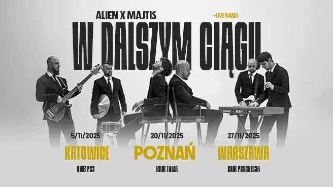 „W dalszym ciągu” to odpowiedź na ogromne zainteresowanie muzyką Alien x Majtis i całkowicie wyprzedane koncerty poprzedniej trasy. Tym razem duet rusza w drogę z pełnym bandem, by w mniejszej liczbie miast stworzyć jeszcze bardziej intensywne i emocjonujące wydarzenia. Bilety na koncerty Alien x Majtis + Live Band już w sprzedaży.