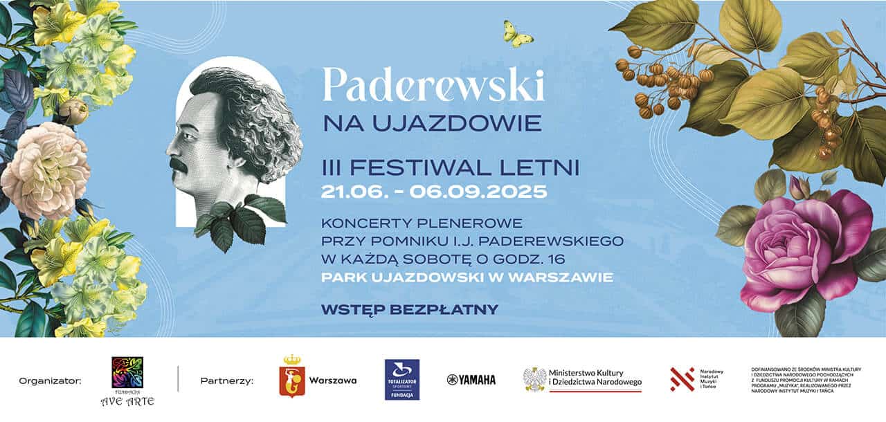 Fundacja Ave Arte zaprasza na trzecią edycję Festiwalu Paderewski na Ujazdowie, który potrwa od 21 czerwca do 6 września 2025 roku. W każdą sobotę o godz. 16:00, przy pomniku Ignacego Jana Paderewskiego w Parku Ujazdowskim, rozbrzmiewać będzie muzyka fortepianowa (i nie tylko) w wykonaniu wybitnych artystów z Polski i zagranicy. Wstęp na wszystkie koncerty jest bezpłatny.